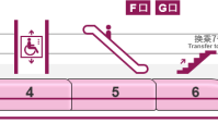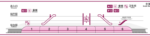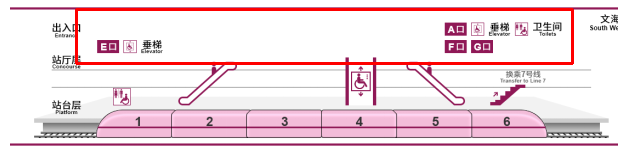 同时,该站配有2座电扶梯,入口分别分布于1车厢与2车厢连接处、5车厢与6车厢连接处。垂梯则位于4车厢中部车门附近。 车厢与换乘信息 在换乘站换乘线路时,还会提供换乘通道信息。