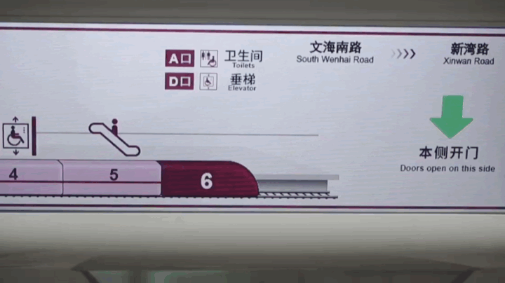 在电客车行驶的过程中,动态地图会展示全线路信息,并突显前方将要抵达的车站。 细心一点的乘客是不是还会发现,两侧的地图虽然显示了同样的线路,但是却有着不同的标识? 在地铁的运行中,有时候会有部分站点开门方向不同于线路其他站点。出现这种情况时,两侧车门会分别闪烁提示“本侧开门”与“对侧开门”,这样具体开门方向便一览无余,即将下车的乘客可提前做好准备。 抵达后