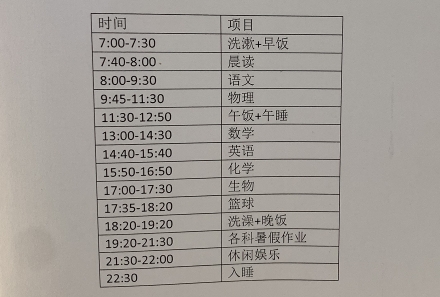 “我7月主要是完成暑假作业,并复习高一内容,进行一些拓展,为以后的‘强基’、‘三一’等做些准备。月底去建德玩几天,放松一下。下个月主要是预习高二内容。”小杨说。 来看看他的一天。 7:00,起床、早饭。 7:40-8:00,早读。语文主要是选修教材,古诗文等;英语是单词。 8:00-9:30,语文学习。我根据自己的薄弱关节,进行古诗文专题的学习。因为平时古文的阅读量少,做古文阅读理解有些吃力。 9:45-11:30,物理学习。主要是学一些高考拓展的内容,为将来走强基、三一做些准备。 11:30-12:50,午饭+午睡。睡个半小时到40分钟。 13:00-14:30,数学。进行一些拓展知识的了解,自己看些数学竞赛的书,做做题,开拓数学思维。 14:40-15:40,英语。背单词,做阅读的题目。当遇到不会的单词,就利用上下文推测单词含义,培养语感和阅读能力,提高阅读速度。 15:50-16:50,化学。自学新课内容,并做些基础的配套练习。 17:00-17:30,生物。 17:35-18:20,在小区里打篮球。有时朋友一起来,就一起打。如果遇到下雨,就7点-8点,到室内球场打。 18:30,吃晚饭。 19:20-21:30,各科暑假作业。每天2个小时,足够投入,所以现在已经完成90%的书面作业了。 21:30-22:00,休闲时间。逛逛B站,刷刷知乎等。 22:30,洗漱后睡觉。 每一道题都不能浪费 看完这一天的安排,小狮妹竖起大拇指的同时,还问了个问题:这么精准的规划,怎么做到的,要靠闹钟吗?如果有时做题太投入,会不会忘了时间? “有时确实会忘记时间,好在我手表有闹钟功能,而且我爸妈都在家,有时也会提醒我。”小杨说,早在放假初期,有节线上班会课,大家都晒了暑期计划表,“还有比我更卷的”。 小杨自己刚度过高一,也有些小建议,想和学弟学妹们分享: 一, 上课真的要专心。 二,利用好每一道题。 举个例子,做一道选择题,每个选项都要仔细看过,才能用好这一套题。因为高中学习时间较为紧张,能刷的题有限,所以每道题吃透很重要。即使错误的选项,也不要放过,要知道为什么错,每道题都不能浪费,这才是真的用好了这道题。 03 早7点上学,晚7点回家 每天在学校自修12小时 女生小姚是杭州一所重高的新高三学生,假期初,她就做了张计划表,把自己安排得明明白白。 公办小学读书,后进入一所热点民办初中,中考考入“前三所”重高。选考政治、历史和生物,在班里成绩靠前。 “学校教室、图书馆、食堂都是开放的,我们提交申请后,就可以去学校里自修。这个假期,我还是按照以前上学时学校的作息时间,每天7点到校自己学习的。和大家在一起,感觉复习氛围很好,自己能更投入。”小姚说。至于学习的秩序,小姚说,虽然没有老师,大家都挺自觉的,很安静,没有人交头接耳,连移动桌椅都是轻轻的。只有一位图书馆的值班老师,维持下日常秩序。 来看看她的一天。 6:30起床,吃完早饭后,走路10分钟去学校。家原本离学校不近,所以专门租了套房子。 7:00到校后,开始背书。政治和历史。 8:00-10:00,进行数学的总体复习。因为说自己数学较弱,所以多花些时间。做些专题性的复习,比如最近进行的是导数和解析几何的专题,对高一、高二知识进行第一轮回顾,希望能搭建起高中数学的整体框架。之后是针对数学做纠错和整理。 11:50,去学校食堂里吃饭。饭后午休20分钟。 13:00,下午主要是完成各科的暑假作业。大约做1-1.5小时作业,起来活动一下。准备在7月把所有的暑假作业完成,目前进度已有90%。8月就可以自己有针对性地安排了。 19:00回家。这之后是自己安排的整理时间。比如历史会根据学校进度安排表,背知识点;生物做一些辅导资料等。 21:30完成后,开始看英语原版小说。 23:00上床睡觉。 高一打好语数英基础 她对于新高一同学的建议: 一,高一时,学会做计划,找到适合的节奏。 一开学就十门课全开,有些同学的适应期会很长,感觉每天晚自修做完作业,没时间自己复习,所以要快速找到自己合适的节奏。可以做计划,把每天要做的事情列出来,按照事情的轻重缓急,挨个完成。完成后划掉。对于规划一天,还是挺有帮助的。 二,语、数、英基础一定要打好。 对于不少同学来说,最后选科的300分差距不会很大,那么最大的差距就在语文、数学和英语了。高一的重心一定放在这三门。 比如语文,要提前积累作文素材。因为到了高三,作文的差距就会拉大。高二时作文题目不算难,同学们的素材积累也差不多,60分满分的作文,班级平均分都有46。但是到了高三,题目变难,对于素材要求更高,有时一篇作文能相差20分。所以,有空的时候,积累时评等素材,很重要。 数学,我觉得纠错最重要。特别在高一,每个知识点都是新的,一个点没吃透,考试遇到就不会。所以错题一定要啃好,落实掉。 英语,我觉得做题是有必要的,但不要盲目。看原版小说,积累续写素材,毕竟作文有40分。英语最好有个整理笔记,可以有系统的、成模块的,纠错和复习。 |