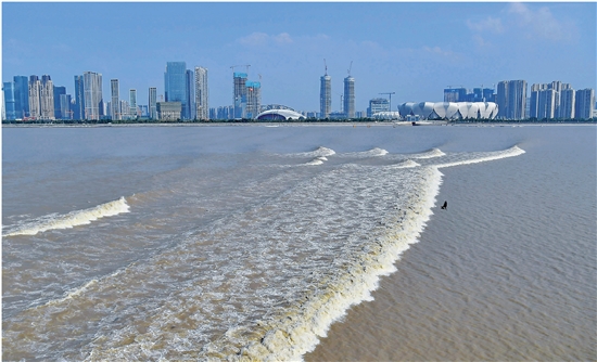 浙江日报 8月21日,农历七月初三,天文大潮日。远眺杭州奥体博览城,大潮奔涌,蔚为壮观。受闰月等多重因素影响,今年农历七月的大潮可媲美往年农历八月的年度最大潮。