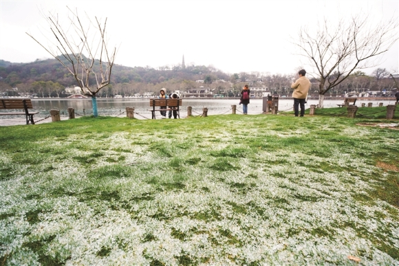 受寒潮影响,昨天上午,杭城多区域降霰,西湖白堤也盖上了一层白白的薄冰。据省市气象台消息,目前寒潮降温影响已进入尾声,但未来一周,“低温”和“阴雨”依然是天气的关键词,24-26日杭州的最低气温在0~3℃,27日开始气温略有回升,但最高气温也仅在9~10℃。