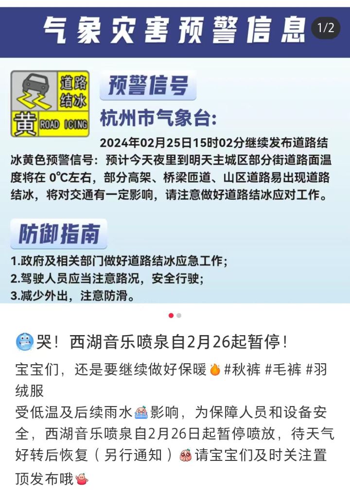 刚刚,潮新闻记者从杭州西湖水域管理处了解到,因气象部门道路结冰预警以及后续雨水影响,为保障人员和设备安全,西湖音乐喷泉自2月26日起暂停喷放,待天气好转后恢复(另行通知)。
