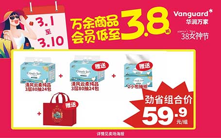 3月1日至3月10日,华润万家万余商品会员低至3.8折。品牌文胸、女装专柜、棉拖3.8折,卫生巾护垫5折优惠,苏菲、护舒宝、高洁丝等多家明星品牌全部参加,牙刷、湿巾、洗衣凝珠5折,抽纸卷纸手帕纸等日常必备纸品、洗衣液、洗衣粉、洗洁精等国产家庭清洁用品、牙膏、电动牙刷、沐浴露、国产成人洗发水等诸多品类通通6折,男士护理及女士护肤6折,还有散装零食8.8折,包装休闲小食第二件5折,燕之坊专柜6折优惠等多个品类折扣。