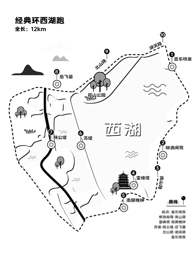 线路全长约12km,以音乐喷泉为起点,途经柳浪闻莺、南山路、雷峰塔、南屏晚钟、苏堤、杨公堤、岳飞墓、北山街、湖滨路,最终返回音乐喷泉。路面整体起伏不大,非常适合新手小白。