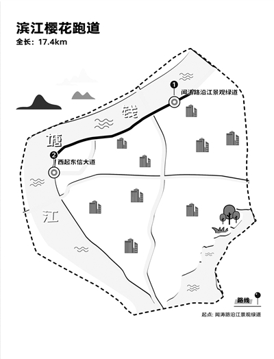 钱塘江边有这样一条跑道,不光日常受到健身人士的钟爱,每年春暖花开之际更是吸引了诸多游客前去打卡,它就是全长17.4km的滨江樱花跑道。