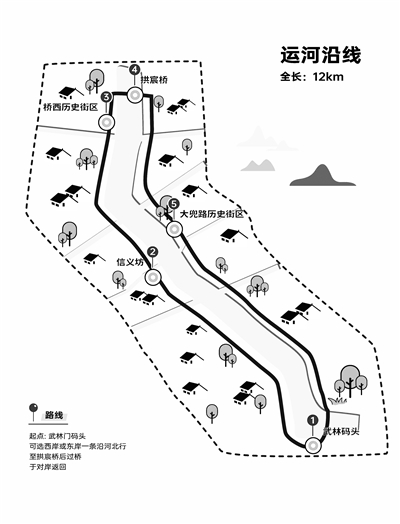 从武林门出发,沿京杭大运河一路向北,由现代高楼林立的“杭州中心”,沿途跑过保存着大量清末民初民居建筑的大兜路历史文化街区,到达于康熙年间重建的拱宸桥后,再沿另一岸从康熙年间一路“跑回”21世纪,在运动中来一场“穿越”之旅。