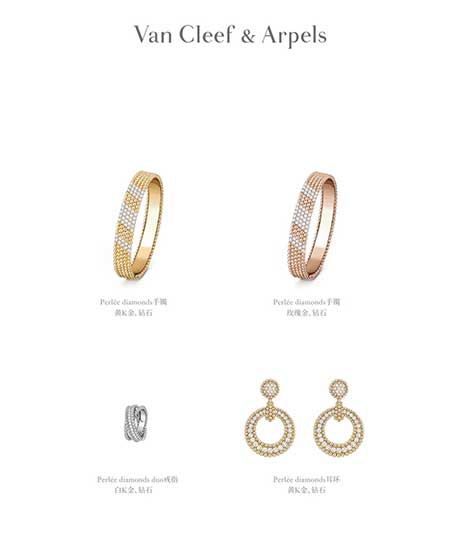 Perlée diamonds手镯黄K金、钻石Perlée diamonds braceletin yellow gold, diamondsPerlée diamonds手镯玫瑰金、钻石Perlée diamonds braceletin rose gold, diamondsPerlée diamonds duo戒指白K金、钻石Perlée diamonds duo ringin white gold, diamondsPerlée diamonds耳环黄K金、钻石Perlée diamonds earringsin yellow gold, diamonds