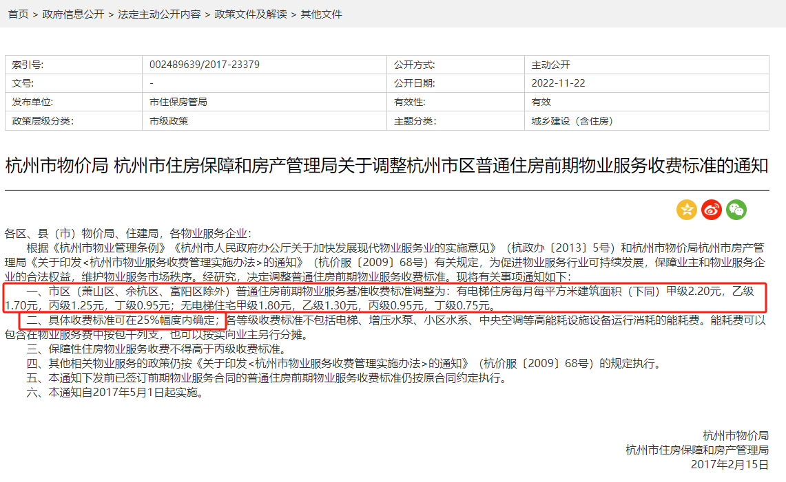 杭州市住房保障和房产管理局网站上,2017年5月1日起实施的《杭州市区普通住房前期物业服务收费标准》显示,市区(萧山区、余杭区、富阳区除外)普通住房前期物业服务基准收费标准为:有电梯住房每月每平方米建筑面积(下同)甲级2.20元,乙级1.70元,丙级1.25元,丁级0.95元;无电梯住宅甲级1.80元,乙级1.30元,丙级0.95元,丁级0.75元。另外,具体收费标准可在25%幅度内确定。也就是说,甲级标准的2.20元可以上浮25%,最高基准价格为2.75元。