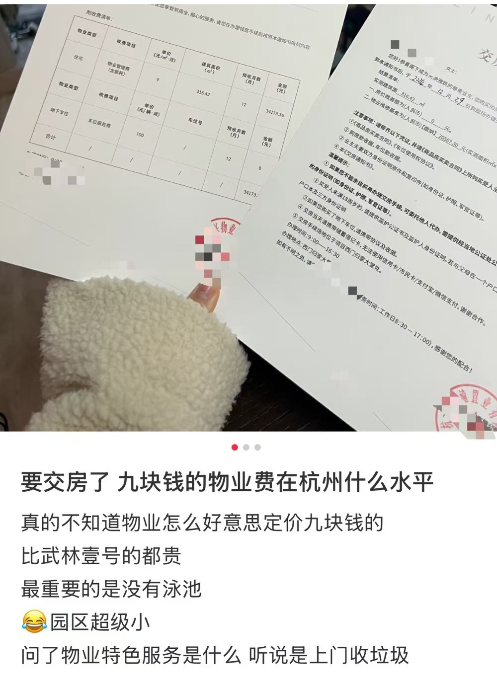最近,一位马上要收房的业主在社交平台上发问:“9元/㎡/月的物业费,建筑面积316.42㎡,一年就要毛3.4万元,小区还没有泳池,这在杭州什么水平?大家的物业费都是多少呀?”