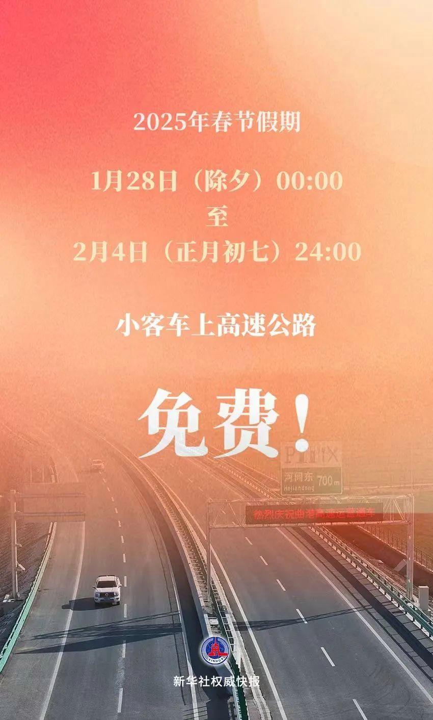 记者1月21日从交通运输部获悉,2025年春节假期小型客车上高速公路继续免收通行费,免费通行时段起止时间为1月28日(除夕)00:00至2月4日(正月初七)24:00,共计8天。