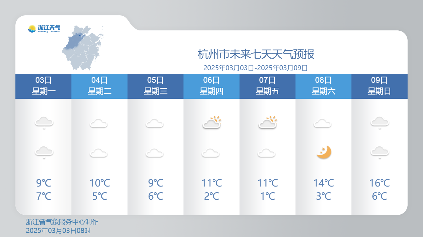 今天偏北风5级阵风6-7级。白天最高气温11度,明天白天最高气温10 度,明天早晨最低气温6度。由于高山区的气温更低,降雨有可能向着雪的相态转化,3日后半夜到4日临安北部、余杭北部等地的高山区局部有小雨夹雪或小雪。