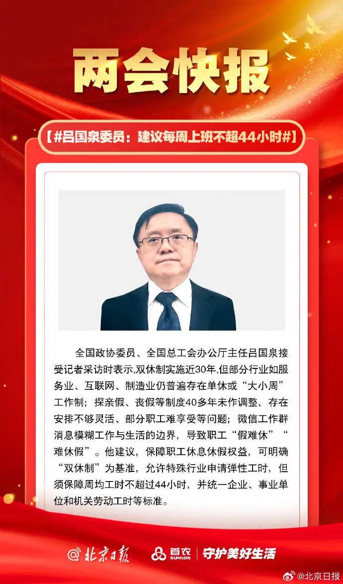 全国政协委员、全国总工会办公厅主任吕国泉接受记者采访时表示,双休制实施近30年,但部分行业如服务业、互联网、制造业仍普遍存在单休或“大小周”工作制;探亲假、丧假等制度40多年未作调整,存在安排不够灵活、部分职工难享受等问题;微信工作群消息模糊工作与生活的边界,导致职工“假难休”“难休假”。
