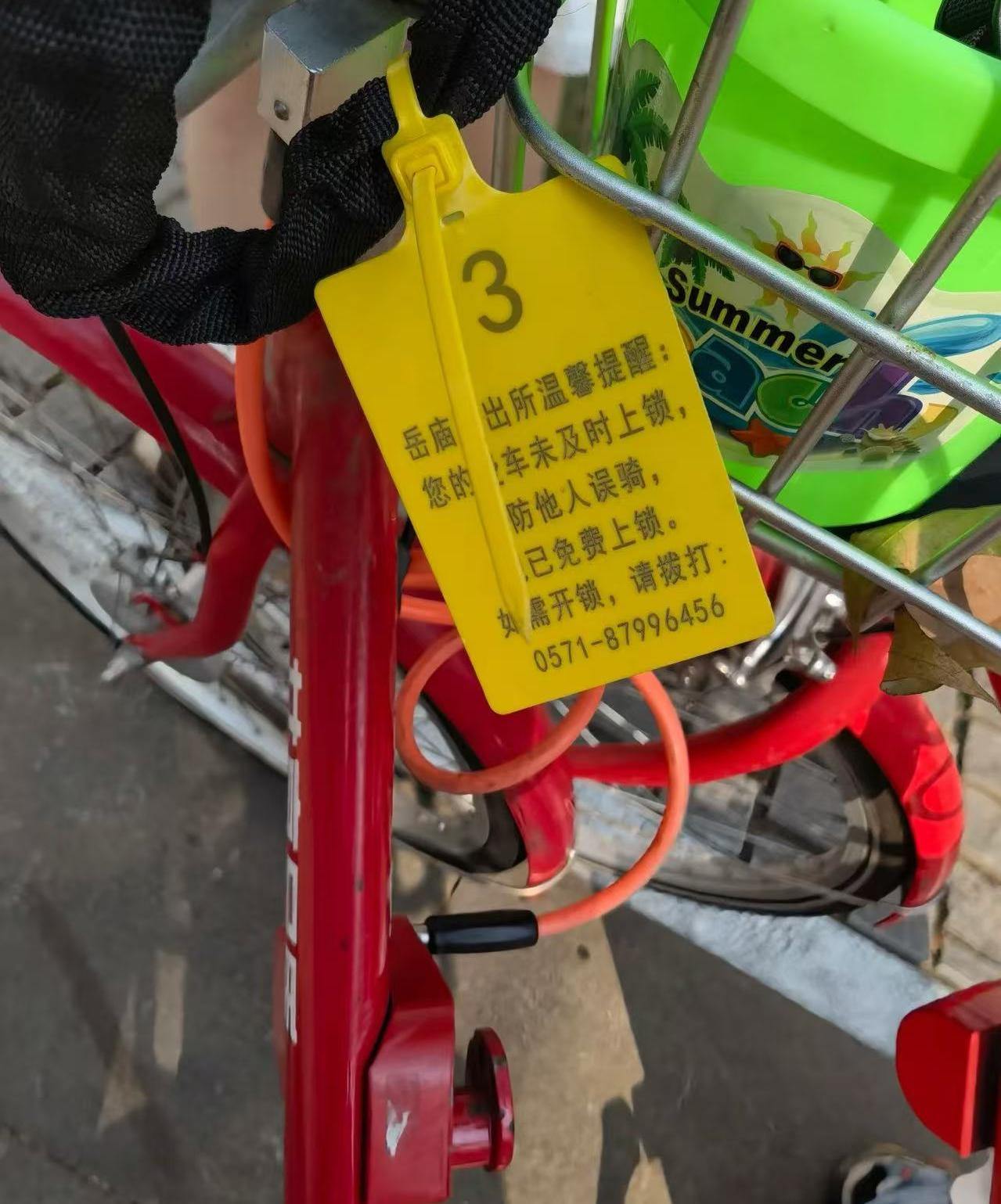 3月2日,杭州市民周先生租了辆小红车,去杨公堤游玩。车子停在路边。回来的时候他发现车上多了一块黄色的吊牌——“岳庙派出所温馨提醒:您的单车未及时上锁,为防他人误骑,现已免费上锁。如需开锁,请拨打……”