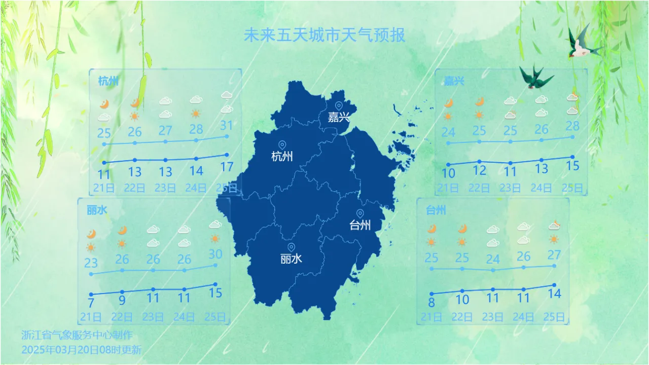 今天(3月21日),全省又是大晴天,起步气温再一次提升。清晨6时,湖州城区气温已经来到了14.3℃;杭州也不低,9.2℃。