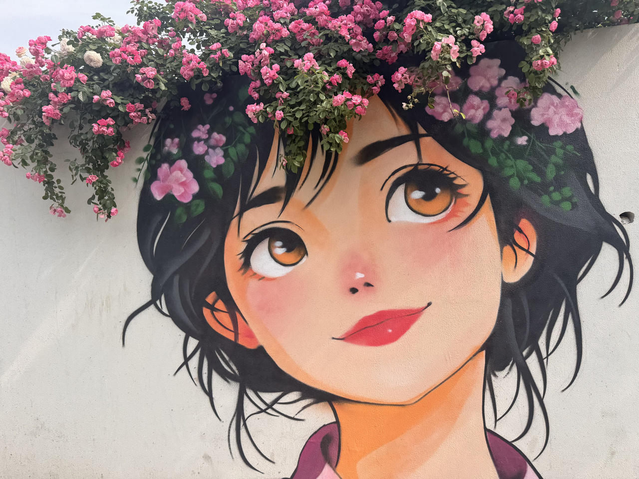 出圈的月季配上可爱的姑娘,杭州花路墙绘美翻