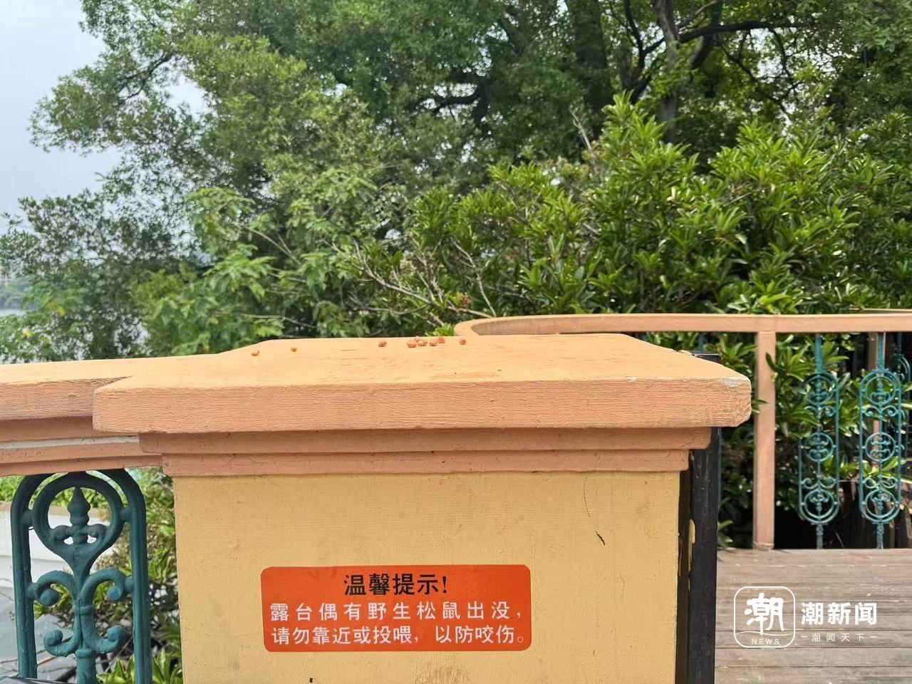 树下一桌客人自带了些瓜子、坚果,放在护栏上,等着松鼠来吃。
