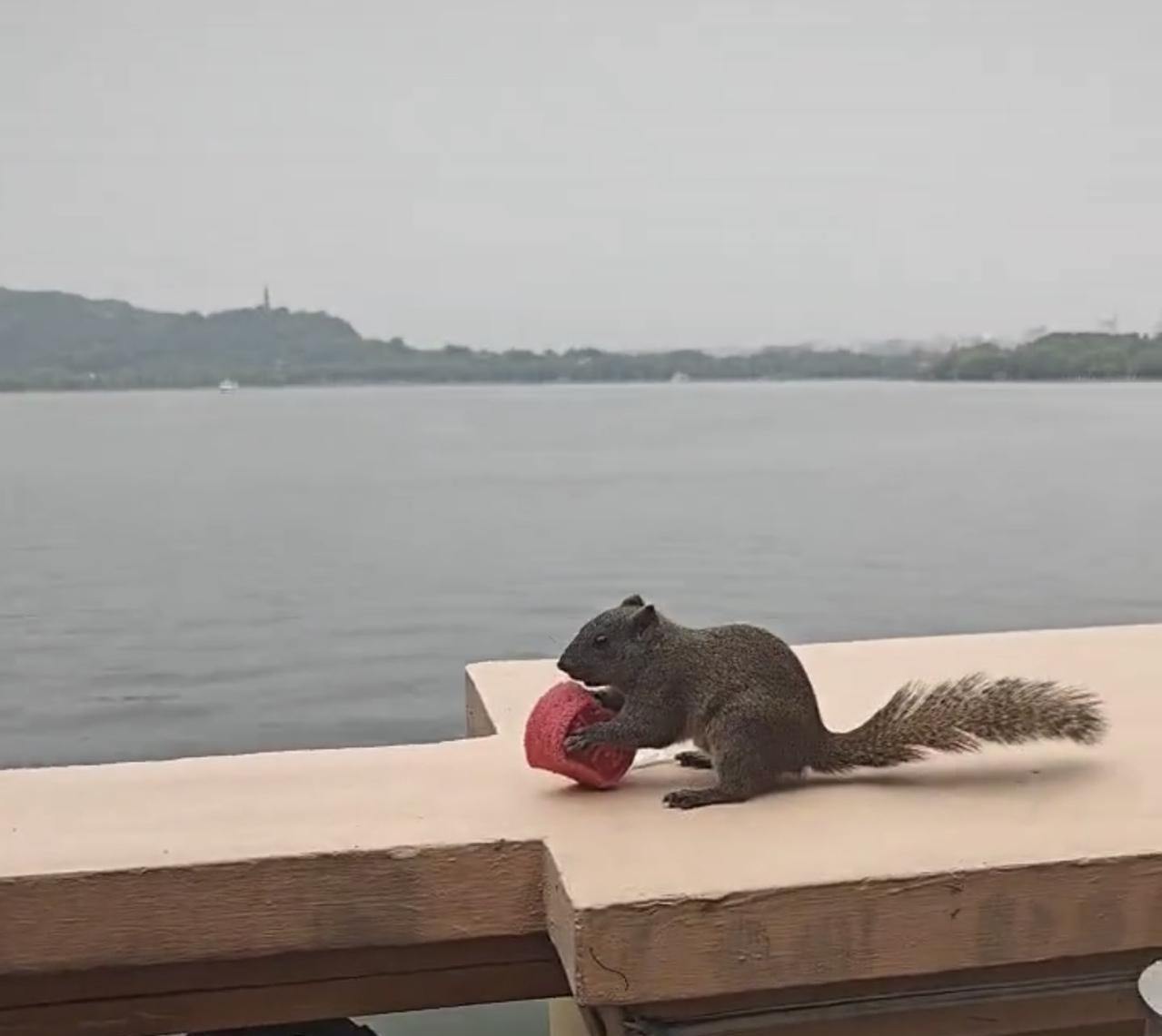 最近,杭州西湖边有一只“蹭吃”的小松鼠火了。