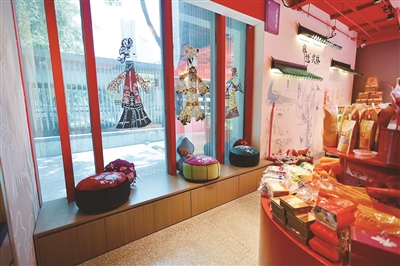体验店在“八少女”喷泉东侧,是一间以古铜和朱砂红为主色调的小木屋,窗户上贴着皮影戏剪纸,屋里挂着古色古香的灯笼和红色帷幔,展示架上摆放着鎏金铜器、天竺筷、双面绣团扇等非遗产品,像个小型非遗博物馆。