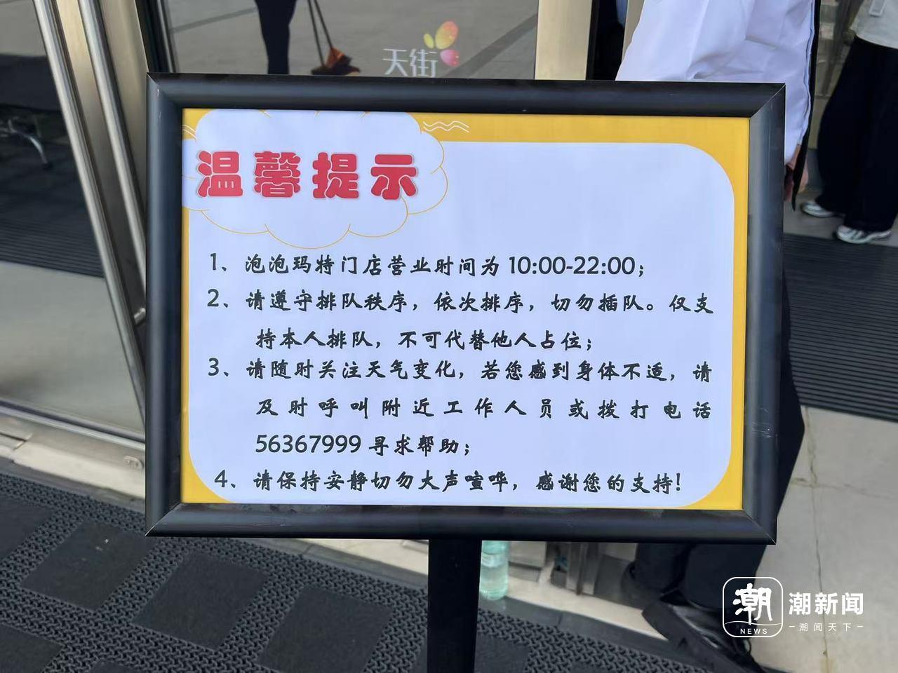 商场大门被分成了两个入口,左边是进入商场的通道,右边则是进入泡泡玛特门店的通道。在进入泡泡门店的通道上,立着一块牌子,上面写着:“请遵守排队秩序,依次排序,切勿插队。仅支持本人排队,不可代替他人占位。”