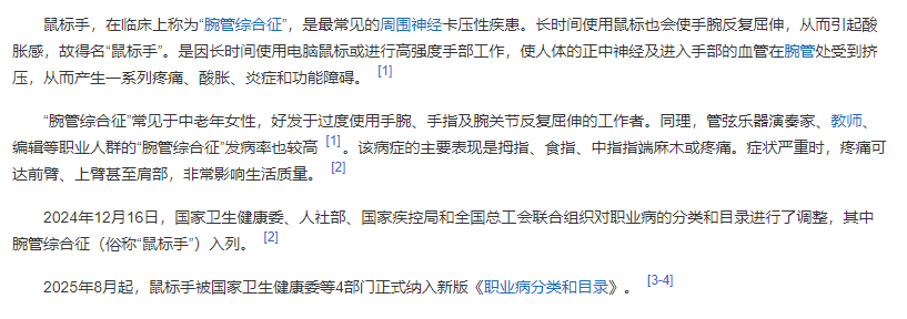我国新版的《职业病分类和目录》从8月1日起正式实施,其中腕管综合征,也就是大家俗称的“鼠标手”,首次作为职业病正式被纳入国家的法定目录当中。