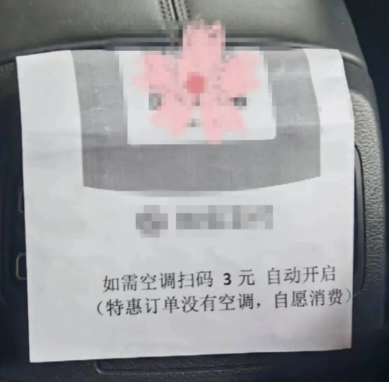 近日,有网友在社交平台反映,乘坐特惠快车时遭遇了有偿开空调情况,车内告示标明“如需空调扫码3元,自动开启”“特惠订单不含空调,自愿消费”,引发网络热议。