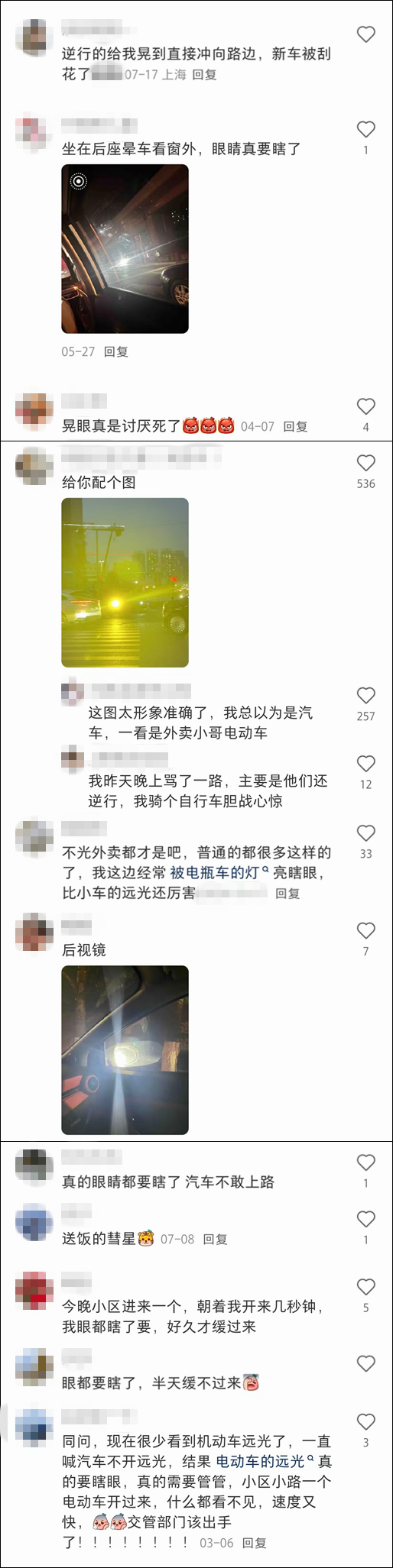 有不少人反映“夜间遇到过迎面而来的强光,瞬间致盲且看不清路”。