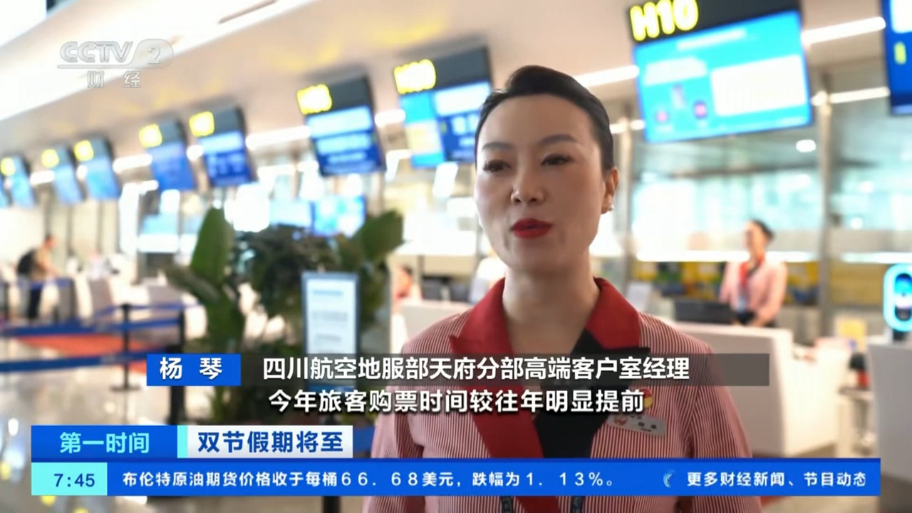 四川航空地服部天府分部高端客户室经理 杨琴:预售情况来看,今年旅客购票时间较往年明显提前,9月30日和10月1日为节前出行的高峰。成都飞往北京、深圳、杭州等地的部分航班客座率已经达到了80%,敦煌、阿勒泰等西北航点机票已经基本售罄。
