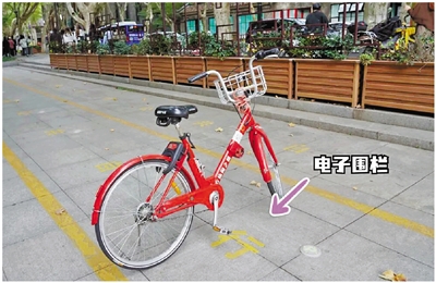 电子围栏服务点通常设置在实体桩服务点相邻区域。工作人员提醒:“骑行者只需留意地面上设置的电子地桩感应器,将车辆对准感应区域同向有序停放即可。”当电子锁小红车进入围栏感应范围时,车锁会发出“嘀嘀嘀”的提示音,方便使用者确认是否成功还车。