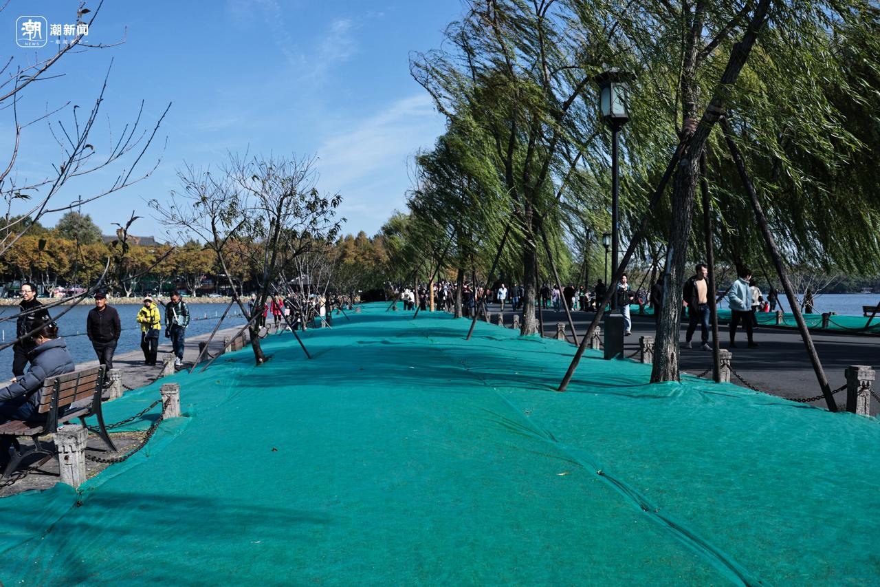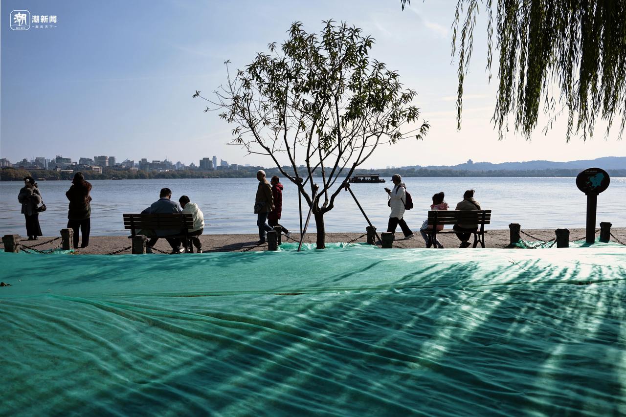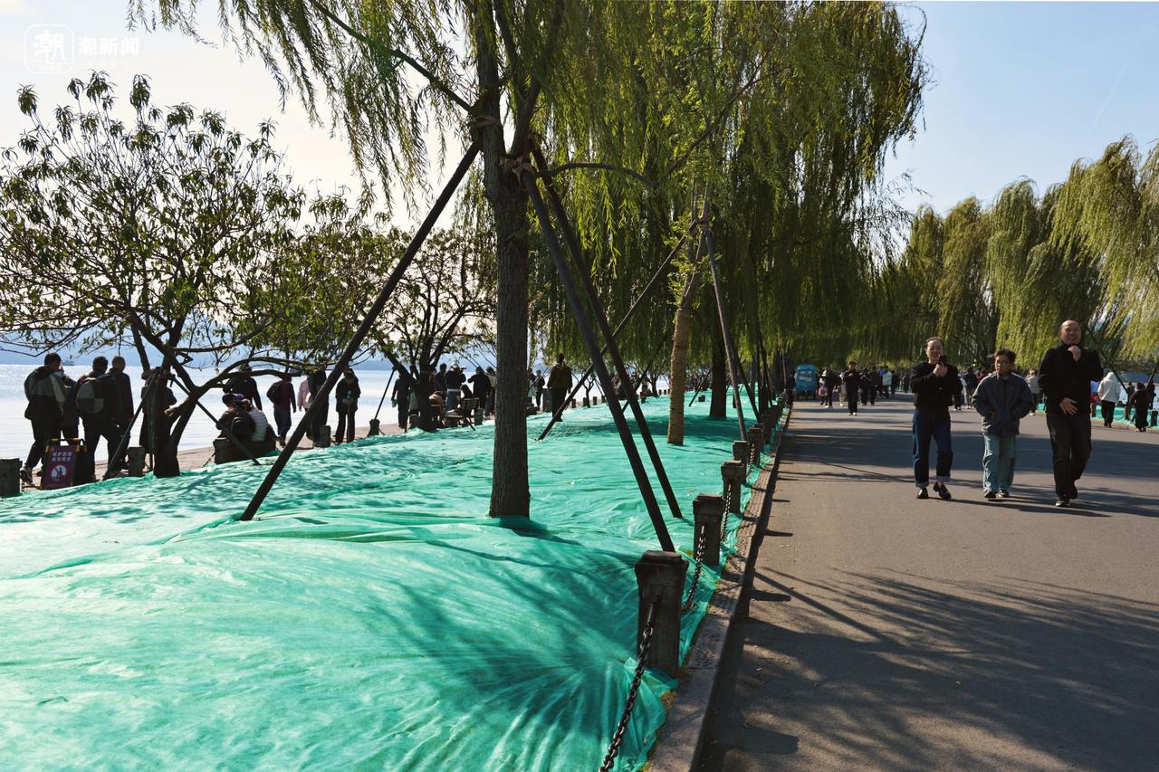 西湖边,白堤小草盖“棉被”,过冬仪式感上线