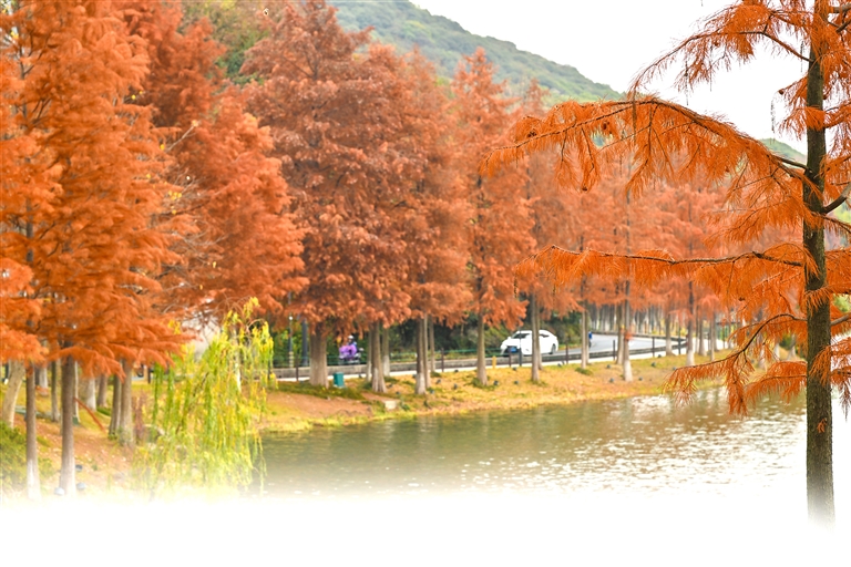 沿着湖堤漫步,仿佛走进一个被打翻的调色盘。水岸边,池杉与水杉褪去青葱,换上一身沉稳的赫红,倒映在清冷的湖水中,如一幅未干的水彩。