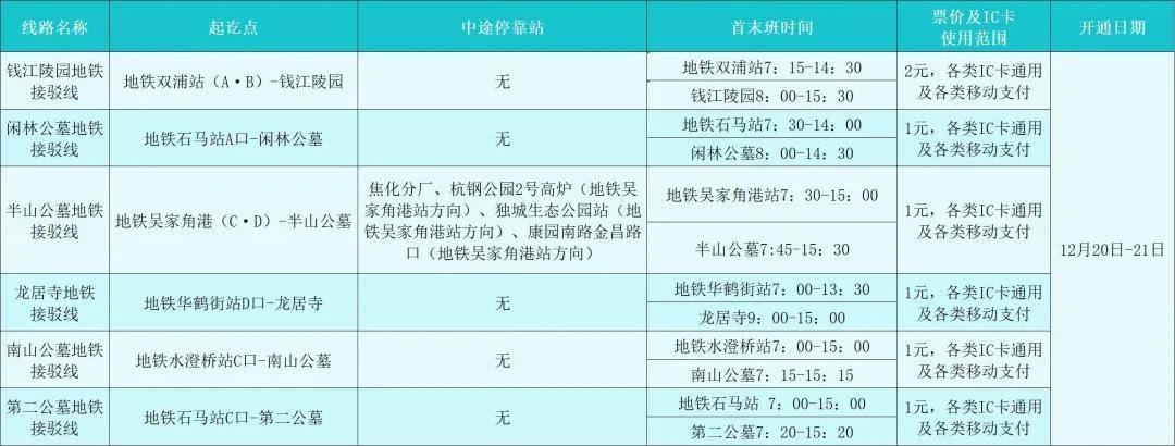 为满足市民冬至祭扫出行需求,杭州公交将在12月20日至21日开通6条扫墓地铁接驳线,分别接驳地铁3号线石马站、华鹤街站,地铁4号线水澄桥站、吴家角港站和地铁6号线双浦站,方便市民乘客通过“地铁+公交”的高效出行方式前往钱江陵园、闲林公墓、半山公墓、龙居寺、南山公墓、第二公墓等地。