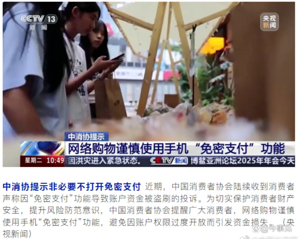 今年3月,中国消费者协会发布消费提示称,陆续收到消费者声称因免密支付功能导致账户资金被盗刷的投诉,提醒消费者谨慎使用免密支付功能,避免因账户权限过度开放而引发资金损失。