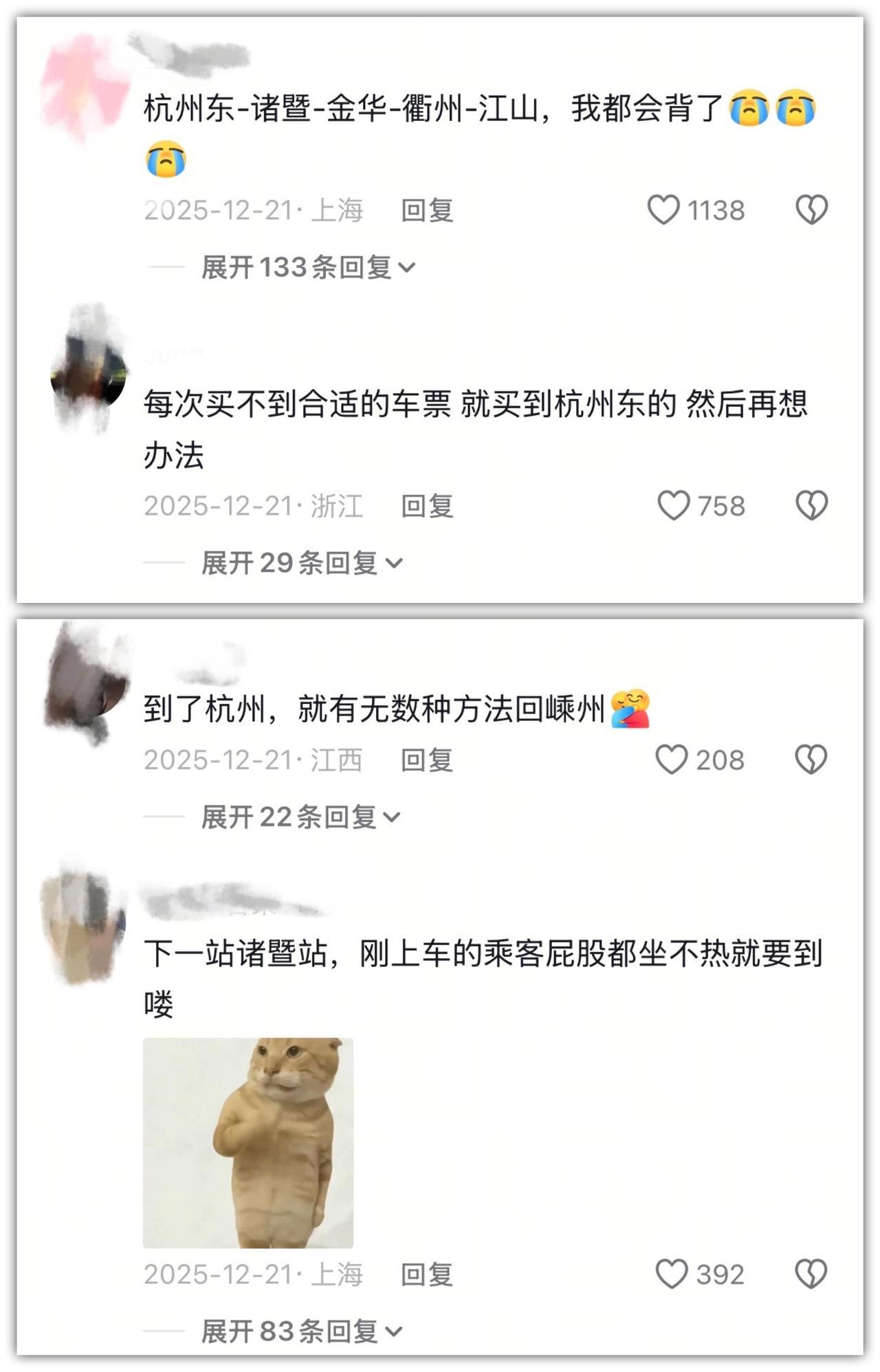 评论里大家纷纷回复:“高铁一过杭州东站,我就该醒了,收拾下小桌板就到家了。”“老家在宁波慈溪,每次一到杭州东站我就感觉到家门口了……”