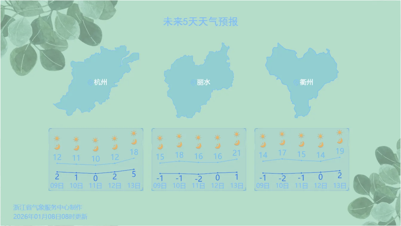 1月10日-11日,有弱冷空气补充,南边比北边暖和一些,像温州、衢州10日最高还能冲击15℃+,而杭嘉湖最高也只能在10℃徘徊。届时,浙中北部分地区有霾。