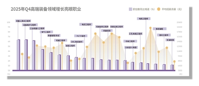 在“强链补链”“智能工厂”“机器换人”等政策与趋势推动下,高端装备行业的人才需求持续增长。其中,机器人调试工程师在高端装备领域中需求增长最快,2025年四季度职位数同比增长64.1%,平均招聘月薪为9908元。