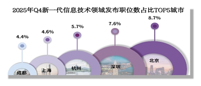 从地域分布看,北京、深圳、杭州、上海、成都是对新一代信息技术人才需求量排名前五的城市,2025年四季度发布的职位数占比分别为8.7%、7.6%、5.7%、4.6%、4.4%。智联招聘分析,这些城市在人工智能、智能硬件等领域持续扩大产业布局、加大科研投入,形成了高技术产业集聚效应,从而带动相关人才需求持续释放。杭州作为数字经济重要城市,在云计算等领域持续释放人才需求。