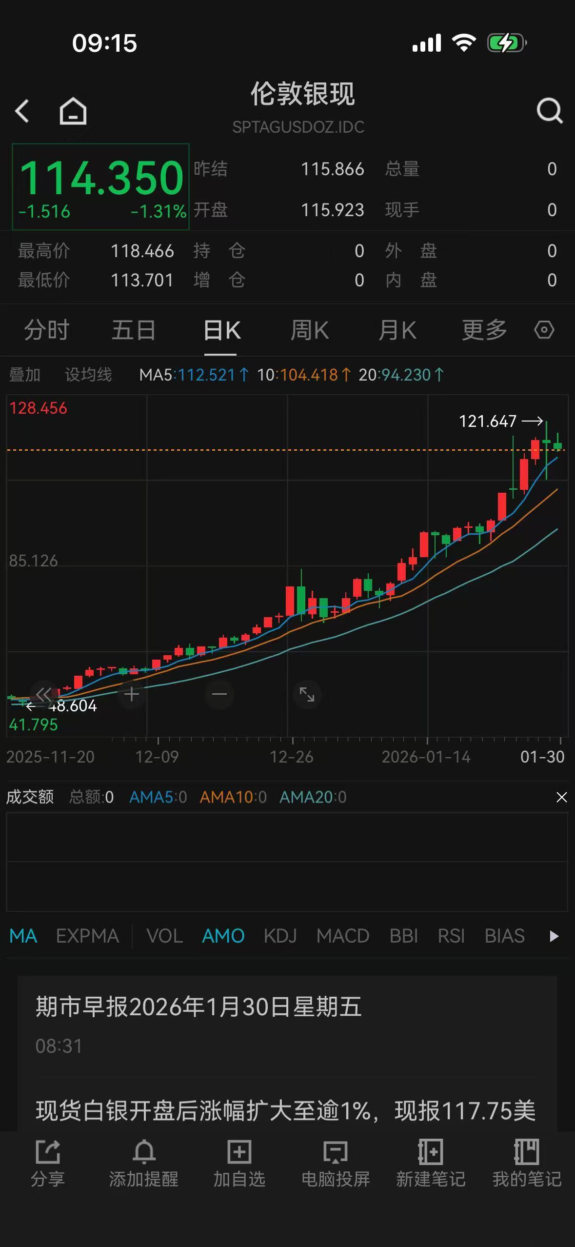 现货白银同样在早盘跌超1%,失守115美元/盎司,昨天,现货白银已经站上121美元/盎司的新高。