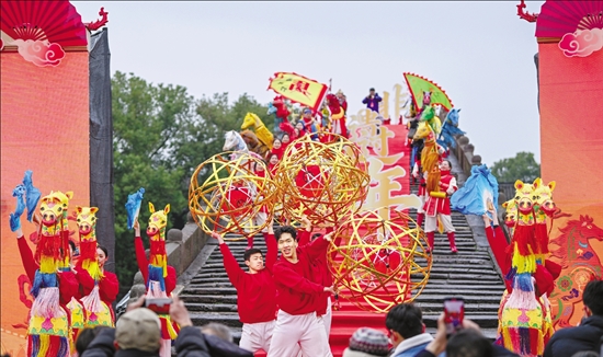 1月31日,杭州临平区“非遗过大年”系列活动在塘栖古镇启动。广济桥头化身天然实景舞台,高头竹马、临平滚灯等传统非遗项目陆续上演。记者 董旭明 摄