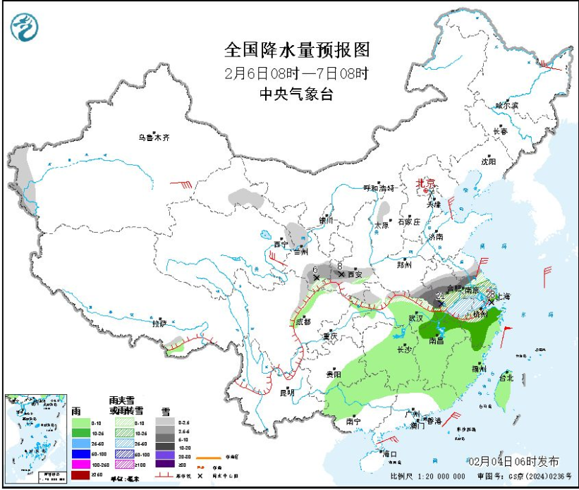 具体来看,5日后半夜到6日,杭州有中到大雨(雪),山区6日早晨起转雨夹雪或雪,局部伴有冻雨,部分积雪3~6厘米,高山区有大到暴雪(临安北部、余杭北部最大积雪深度10~20厘米),平原地区6日下午转雨夹雪或雪,有少量积雪。6日夜里雨雪渐止转阴天。