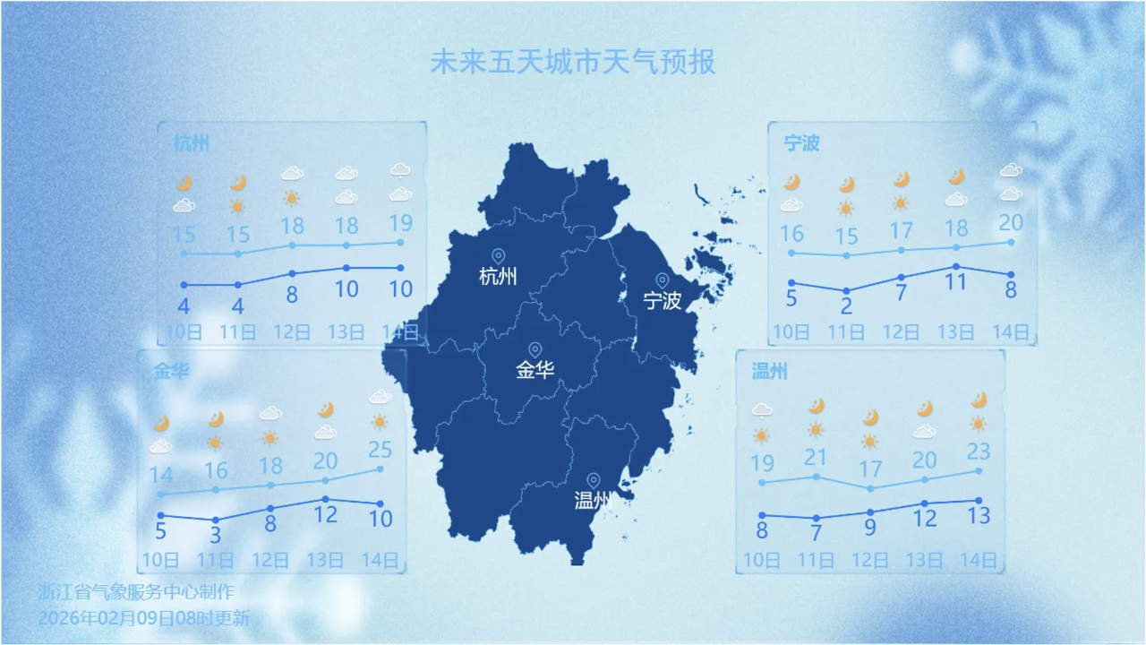 昨天早晨(2月9日),全省近八成站点的最低气温跌破0℃,山区最低-8~-4℃,其他大部地区-4~-1℃。最冷的平原站点镇海也低至-5.8℃,省会杭州则以-2.9℃刷新今冬以来新低。