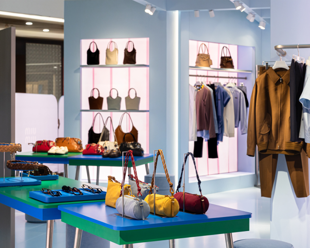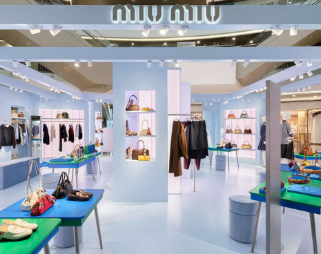 限时店以品牌标志性浅蓝色为主调,缀以粉色细节,在定制化空间布景中,陈列着尽显Miu Miu至臻本真风格的全系列服饰。该系列再度诠释了品牌备受青睐的设计密码:优雅不羁的格调、破格出新的精致美学,以及无拘无束的自由表达。从秀场款式到本次限时店专属设计单品,品牌标志性元素在全品类中焕新演绎。