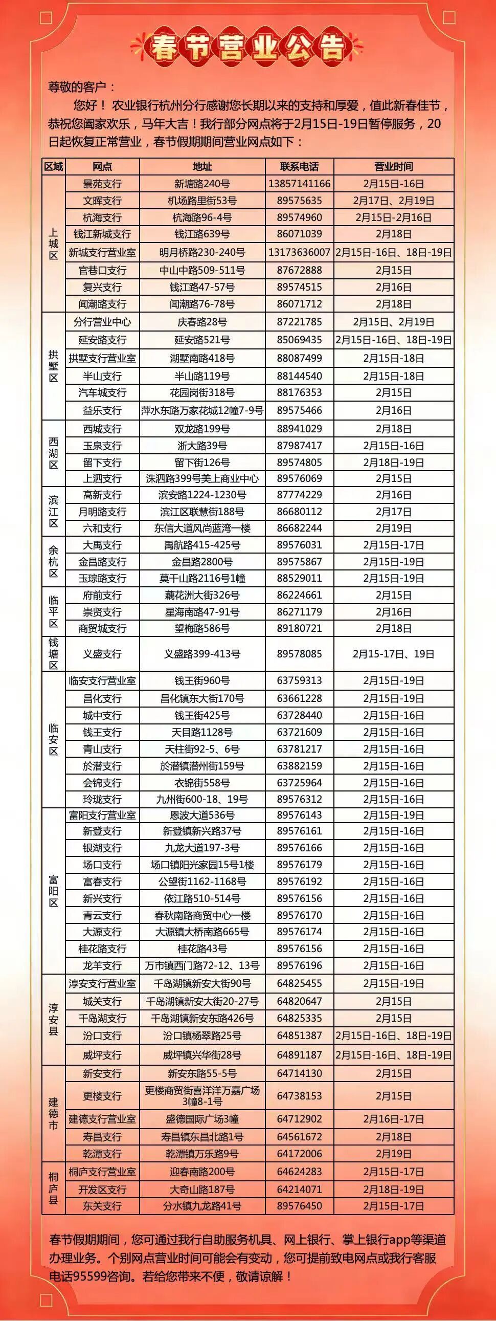 农行杭州分行部分网点于2月15日至19日暂停服务,20日起恢复正常营业,春节假期期间营业网点如下: