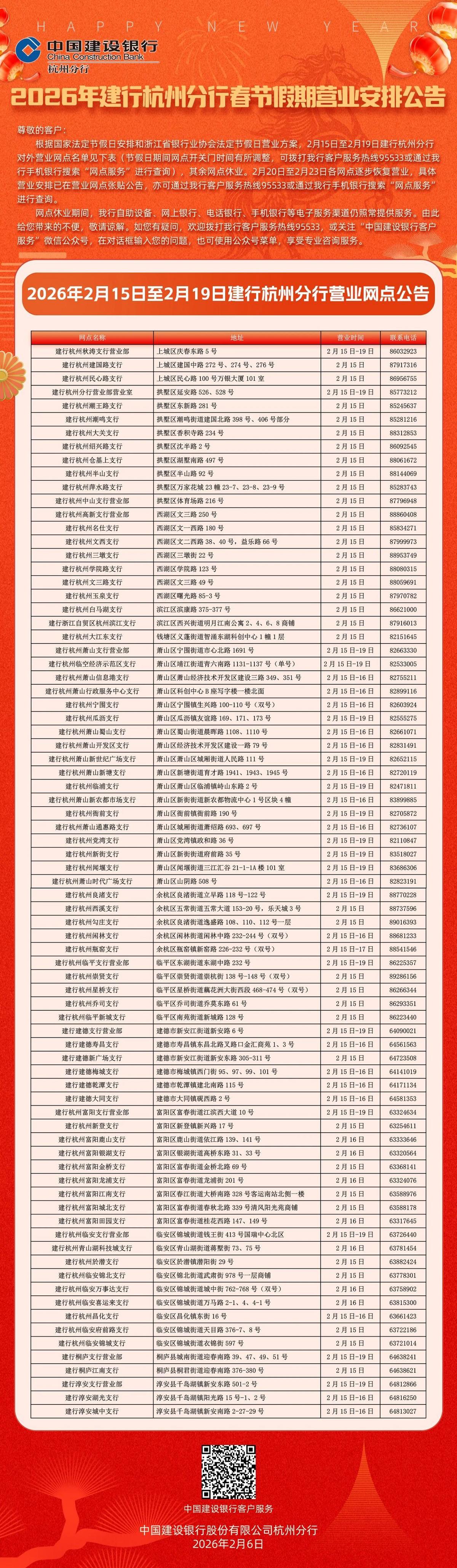 建设银行杭州分行营业部营业室、杭州秋涛支行营业部、杭州萧山支行营业部等2月15日至19日仍对外营业,不过开关门时间有所调整,具体为2月15日营业时间调整为10:00-16:00,2月16日调整为9:00至15:00,2月17日-19日调整为10:00-16:00。
