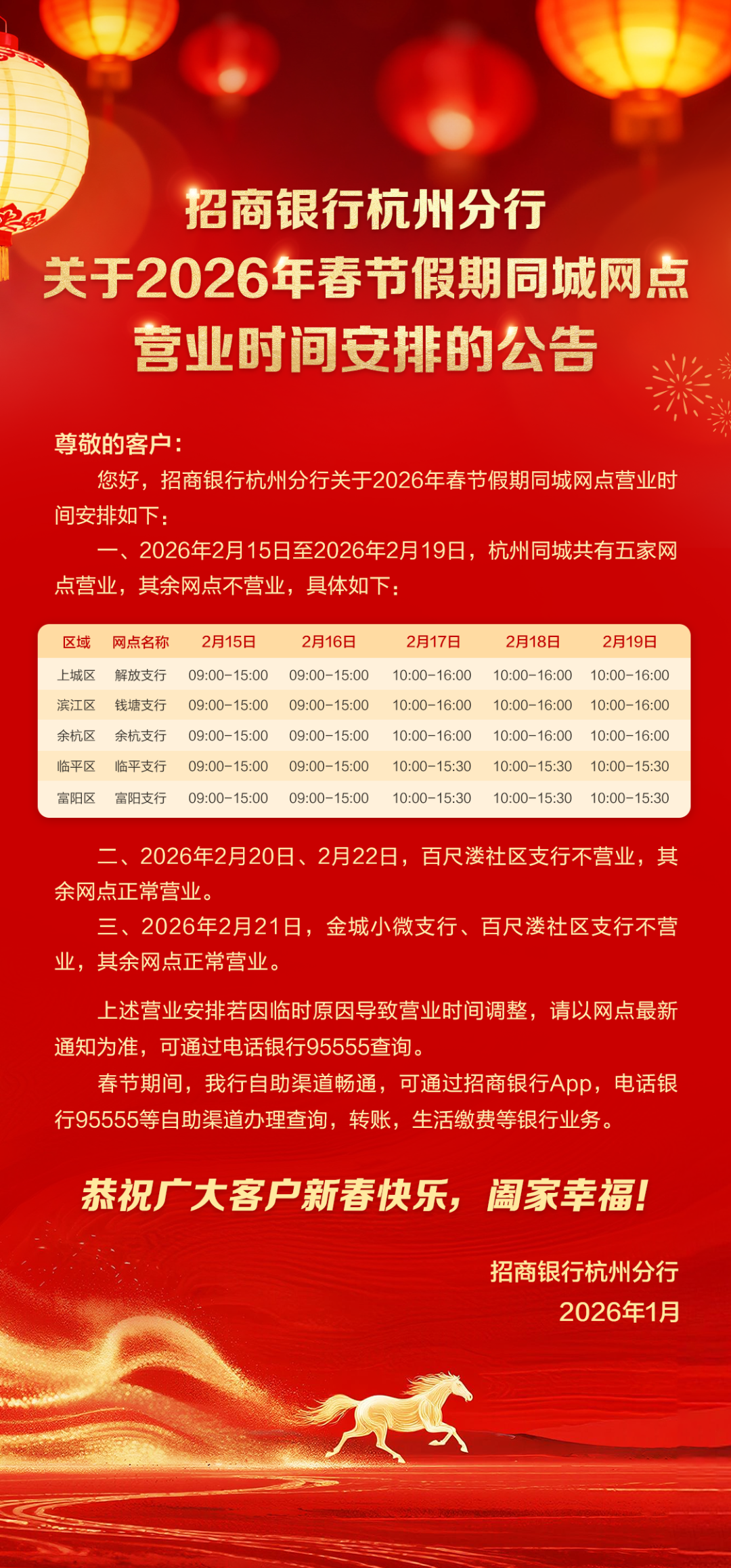 具体来看,杭州江城支行营业室、杭州高新支行营业室、杭州武林支行营业室、杭州羊坝头支行营业室等2月14日至15日营业时间为9:00-17:00,2月16日春节当天营业时间调整为9:00-15:00,2月17日至19日暂停营业,2月20日至23日营业时间为9:00至17:00,2月28日营业时间为9:00-17:00。