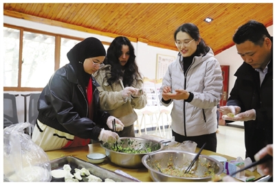 活动尾声,水饺、春卷、汤圆等中国传统美食上桌了。国籍不同的年轻人围坐在一起,有人夹起一颗糖葫芦,酸到眯眼,却竖起大拇指。筷子和刀叉并排放着,用的多是筷子——生疏,但愿意试。