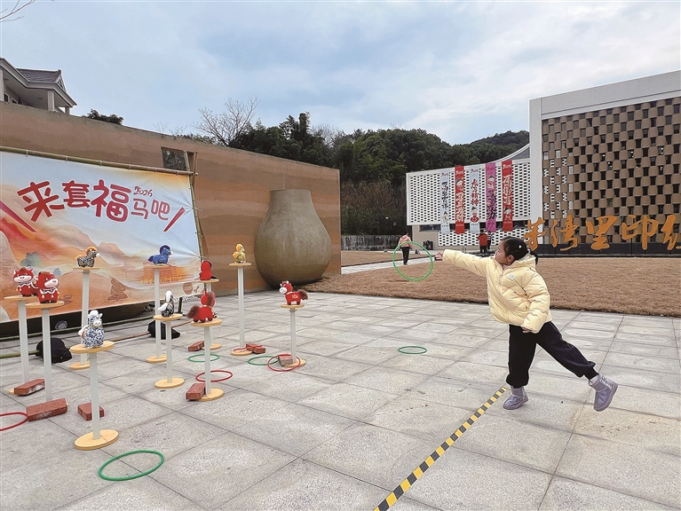 正月初六(2月22日),阳光明媚,位于进化镇的茅湾里印纹陶博物馆门口的“套福马”活动,获得了不少小朋友的青睐。五颜六色的小马玩偶被固定在一个个点位上,激发了大家挑战的热情。“我一直想套那个金色的小马,妈妈鼓励我不要放弃,多尝试几次,终于成功了!”9岁的悠悠跟着爸爸妈妈来逛“家门口的博物馆”,还没进馆,就先玩上了。