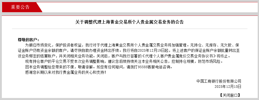 2025年12月15日,工商银行也发布公告表示,为顺应市场变化,保护投资者权益,该行对于代理上海黄金交易所个人贵金属交易业务将加强管理。无持仓、无库存、无欠款、保证金账户仍有资金余额的客户,请尽快自助办理资金转出手续。该行将自2025年12月19日起,将上述客户的保证金账户余额批量转出至该业务绑定的结算账户,并关闭相关业务功能。