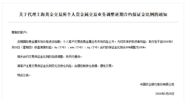 农业银行则宣布自2026年2月26日(星期四)收盘清算时起,Au(T+D)、mAu(T+D)、Ag(T+D)合约的保证金比例从80%调整为100%。该行表示,近期国际贵金属市场价格波动加剧,个人客户交易类贵金属业务市场风险上升,此举为切实保护投资者利益。