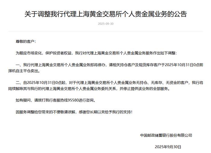 早在2025年9月30日,邮储银行发布公告称,该行代理上海黄金交易所个人贵金属业务即将停办,请相关持仓客户及现货库存客户于2025年10月31日0点前择机自主平仓卖出;另外,自2025年10月31日0点起,对于代理上海黄金交易所个人贵金属业务无持仓、无库存、无资金的客户,该行将陆续解除其与代理的个人贵金属业务委托关系,并停止提供该业务的全部服务。