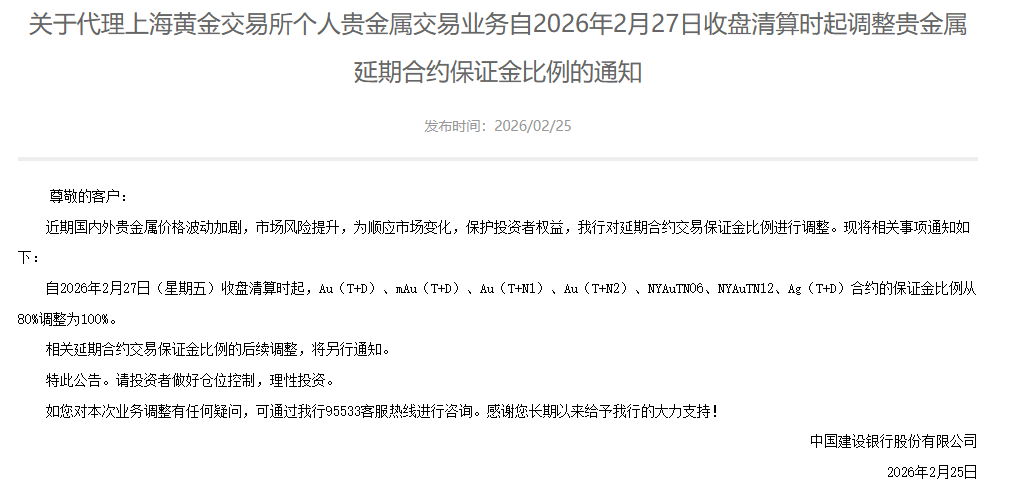 2月25日,工商银行发布公告称,自2026年2月27日(星期五)收盘清算时起,该行代理个人客户Au(T+D)、mAu(T+D)、Au(T+N1)、Au(T+N2)、NYAuTN06、NYAuTN12等合约的标准交易保证金比例由80%调整为100%,差异化保证金作同向、同幅度调整;该行代理个人客户Ag(T+D)合约的标准交易保证金比例由80%调整为100%,差异化保证金作同向、同幅度调整。